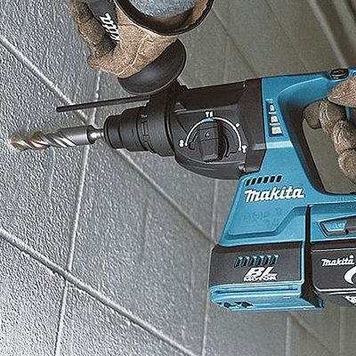 Cordless SDS Hammer drill 18v for hire. This drill is capable of drilling up to 24mm in to concrete. Supplied complete with 240V Battery Charger and 2 x Batteries. When placing your order - please remember to add Drill Bits if required. Additional Information: Features include Easy grip handle giving a comfortable grip and maximum power thrust - 3 mode operation (Rotation + Hammering - Hammering Only - Rotation Only) - One touch sliding chuck allows a quick and easy bit change - OnUnique rubber joint construction suppresses the transmission of vibration to battery terminals - minimizing battery failures such as terminal breakage or poor electrical contact. Based On: Makita DHR242RMJ 18V Rotary Hammer SDS+ 24mm Battery Type: Lithium-Ion Capacity in Concrete: 24mm Capacity in Steel: 13mm Capacity in Wood: 27mm Impact Energy: 2 J Blows per Minute: 0 - 4700 bpm No Load Speed: 0 - 950 rpm Vibration - Drilling: 3.5 m/sec² Vibration - Hammer Drilling: 13.5 m/sec² Vibration - Chiselling: 10.5 m/sec² Vibration K Factor: 1.5 m/sec² Net Weight: 3.3kg