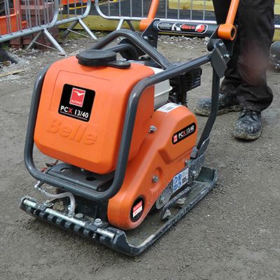 400mm Petrol Vibrating Plate Compactor Hire. This 400mm Petrol Vibrating Plate Compactor sets the industry standards for low vibration coupled with a high compaction rate. The compactor has a fold-able mounted guide handle offers superior manoeuvrability and can be lowered to operate under obstacles and close to form work. Using a 400mm Petrol Vibrating Plate Compactor indoors or in confined spaces could cause fatal carbon monoxide poisoning. If using the machine internally make sure a full assessment has been carried out and suitable ventilation is in place. A fume extractor is recommended for all internal use. Also known as: Plate Compactor - Vib Plate - Vibrating Plate - Wacker Plate and Whacker Plate. Based On: Belle PCX 13/40 400mm Petrol Vibrating Plate Compactor Plate Size W x L: 400 x 606mm Weight: 81kg Centrifugal Force: 13kN Travel Speed: 20m/min Vibration Level: 3.2 / 4.53m/sec²